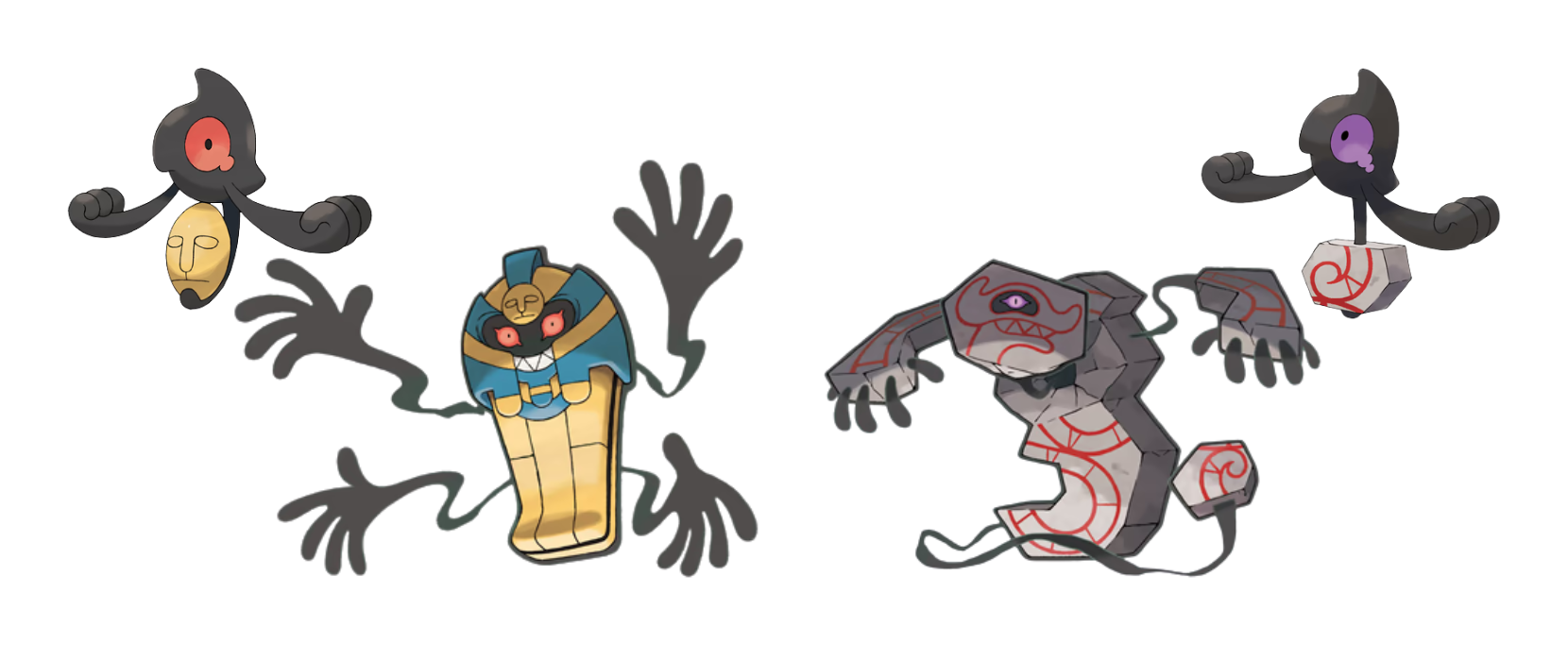Na região de Galar, a maldição toma nova forma com Runerigus, uma pintura antiga corrompida pela essência de um Yamask. Seu corpo é composto por rochas marcadas por símbolos sombrios, e tocar nele significa testemunhar as memórias horríveis de sua criação. Essa tríade espectral é o reflexo de como dor, lembrança e vingança se entrelaçam no pós-vida Pokémon.