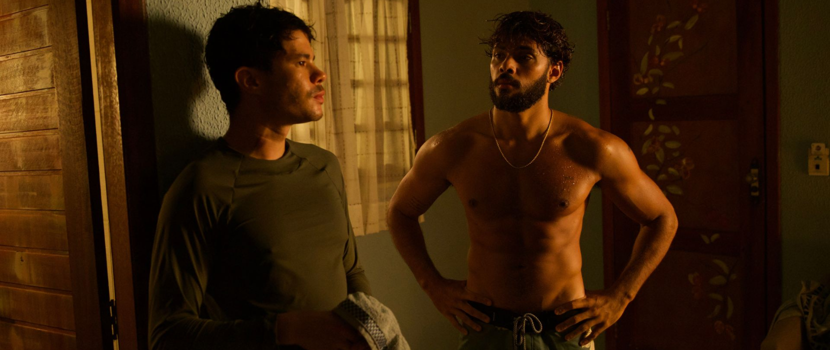 Vinicius Teixeira assume o desafio de dar vida a Lucas, papel que antes foi de Jesuíta Barbosa no curta original. O resultado, porém, é um Lucas mais travado, introspectivo e, por vezes, perdido em sua própria jornada emocional. O personagem carece de consistência, talvez pela dificuldade de conexão entre ator e roteiro, ou pela falta de aprofundamento na construção de sua personalidade no longa. A melancolia silenciosa que Jesuíta imprimiu ao personagem deixa saudades. Já Felipe, interpretado agora por Gabriel Fuentes, surge como o verdadeiro eixo de equilíbrio da narrativa. Se no curta Victor Sousa entregava um Felipe desejado, porém inocente, Fuentes leva isso além, construindo um personagem sedutor, ciente do impacto que causa e disposto a explorar isso ao máximo. Um verdadeiro “Amante Profissional”, com uma vida que beira o superficial e sem grandes perspectivas de futuro. A química entre os dois protagonistas é inegável, alimentando o espectador com dúvidas constantes: Felipe gosta de Lucas ou está apenas brincando com seus sentimentos? Ele é hétero, gay, bi? O mistério em torno de Felipe é justamente o motor emocional que impulsiona a jornada de Lucas.