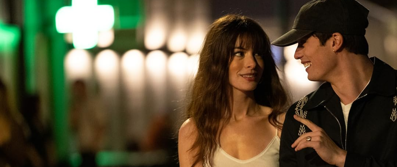 Hayes, inicialmente, é um dos elementos mais problemáticos da narrativa. A forma abrupta como tudo acontece entre ele e Solène, um encontro acidental que rapidamente se transforma em paixão, parece carecer de base e lógica interna, soando quase como uma conveniência do roteiro. Mas o filme se mostra inteligente ao, em determinado ponto, oferecer as explicações necessárias para que o espectador compreenda que não se trata apenas de um romance instantâneo sem fundamento, ainda que a sensação de irrealidade persista em partes. Nicholas Galitzine conduz bem seu papel, entregando um galã sensível e intenso que se afasta completamente das figuras mais tradicionais que interpretou recentemente, como Henry ou Robert. Ainda assim, Solène é quem verdadeiramente sustenta o filme. Em vez de viver a suposta crise da meia idade, ela se vê envolvida em dilemas ainda maiores: precisa encarar não apenas o tabu de se relacionar com um homem muito mais novo, mas também os impactos que isso causa em sua vida pessoal, em suas relações e na forma como é vista pelo mundo. A mídia e as redes sociais se tornam antagonistas adicionais, ao sensacionalizar seu romance e atacar justamente o fato de ser uma mulher mais velha ao lado de um jovem astro pop. Nesse terreno delicado, Anne Hathaway brilha. Ela combina a doçura romântica que lembra Mia Thermopolis com a maturidade de uma mulher de quarenta anos, criando uma protagonista complexa, vulnerável e forte, que tenta redescobrir o amor enquanto lida com as cicatrizes de experiências passadas e os julgamentos de seu presente.