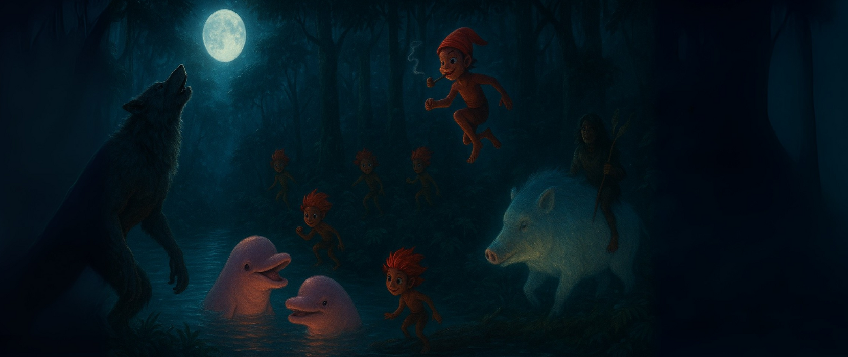 O primeiro conto, O Lobisomem, traz a história de Dona Aninha, moradora de Passagem, que após dar à luz sete meninas finalmente teve um filho, Sebastião. O menino, no entanto, nasce marcado pelo destino de se tornar Lobisomem, e a mãe passa a carregar o peso da responsabilidade de quebrar a maldição quando ele completar treze anos. A narrativa combina o drama familiar com a atmosfera de medo popular, revelando como a maternidade pode se entrelaçar ao sobrenatural e à superstição. Já em A Guerra das Curupiras, acompanhamos uma reunião mítica entre os protetores da floresta para discutir as constantes invasões humanas. O encontro reúne figuras lendárias como o Curupira mais velho, Solimões, Santarém, Rio Negro, Pará e Kilaino, que decidem punir tanto os índios que se arriscam demais quanto os caçadores que destroem o equilíbrio das matas. O conto exalta o poder da natureza como força viva e vingativa diante da exploração humana.